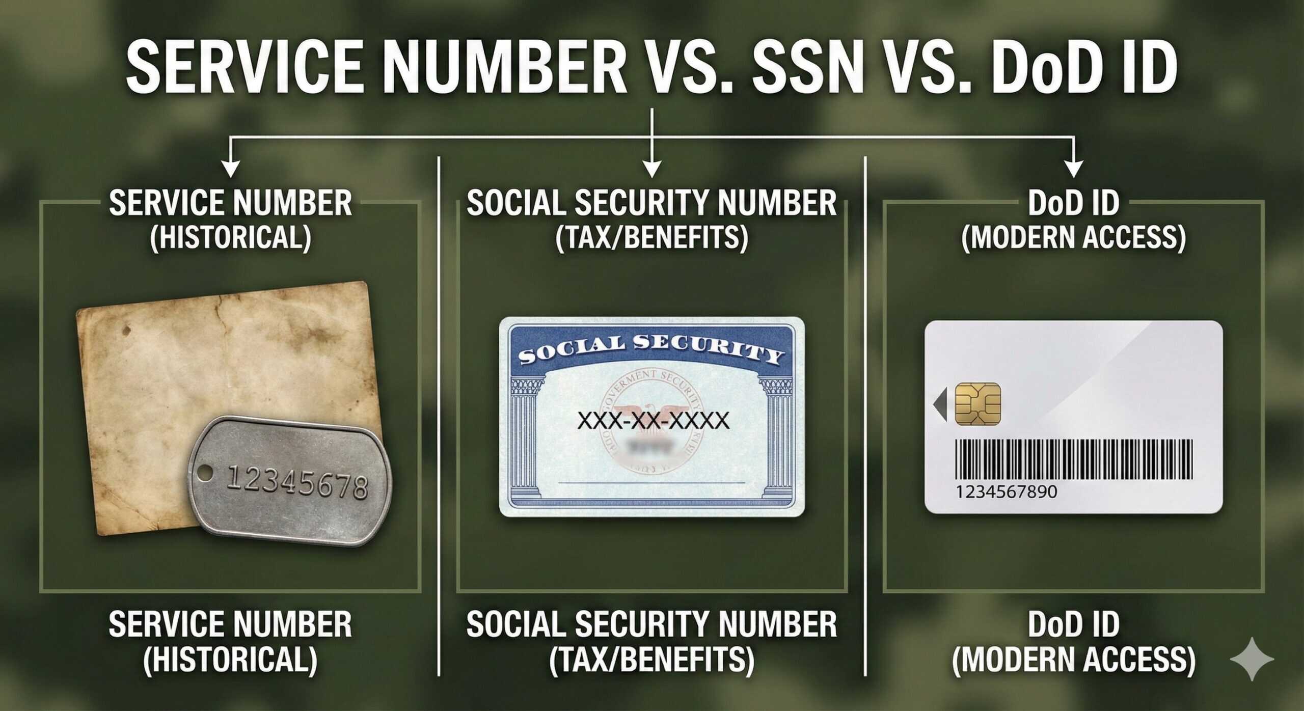 | Service Number | 1918 to the 1970s | Historical military personnel identifier used to track records, pay, and benefits | Older discharge papers, veteran documents, archived personnel or medical records | No. Useful only for historical or benefit lookups |